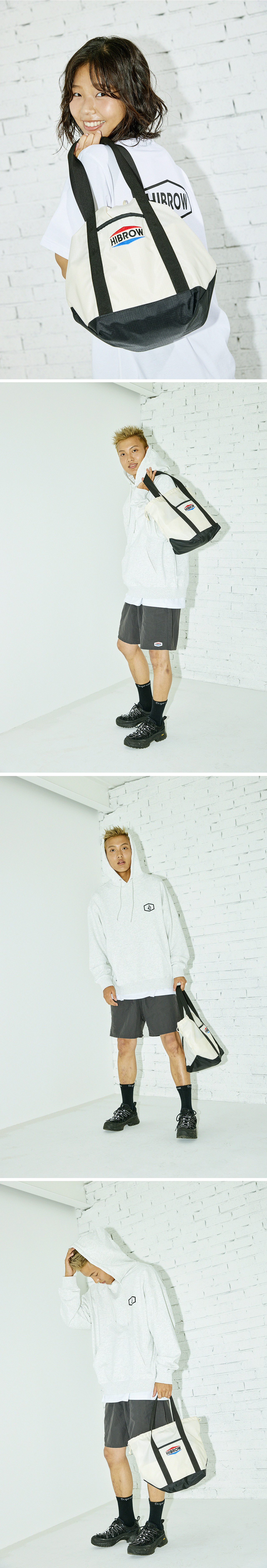 하이브로우의 어패럴 제품은 한번 쓰고 버려지는 비닐이 아닌, 튼튼한 소재와 손잡이로 쇼핑백처럼 재사용할 수 있는 리유저블 비닐팩에 담겨 전달됩니다. 제품을 꺼내기 쉽도록 지퍼 부분에는 옥수수 전분가루가 발라져 있어, 일부 티셔츠에 흰 가루가 묻어 있을 수 있습니다. 몇 번 털어주면 쉽게 떨어지며, 많이 묻었을 경우에도 세탁이나 스팀 다리미로 깨끗하게 사라지니 걱정하지 않으셔도 됩니다.